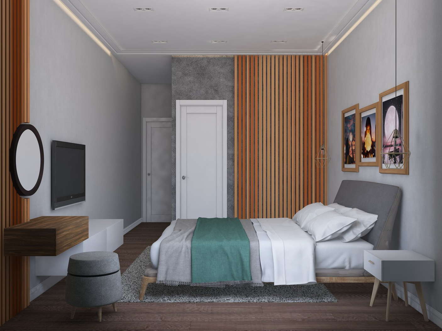 Финальная работа Михаила Коткова по курсу 3D Визуализации: интерьер спальни с установленными источниками освещения, материалами и текстурами.